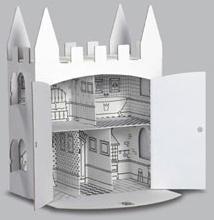 Leuk voorbeeld is het poppenhuis gemaakt van wit karton. De binnenkant bestaat uit 5 kamers die ingekleurd kunnen worden. Beneden in het kasteeltje heb je een luxe hal, de koninklijke woonkamer met 2 troontjes en de keuken. Boven vind je de badkamer met bad op pootjes en een royale slaapkamer met 2-persoonsbed en een luxe open haard.