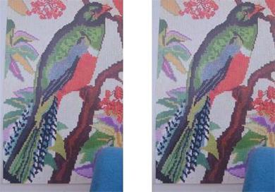 Werkwijze: Je koopt grof stramien en stevige mooie kleuren knotten wol en een borduurnaald die dit werk aan kan. Je maakt mega grote kruissteken, zodat je een supergroot geborduurd werk krijgt.