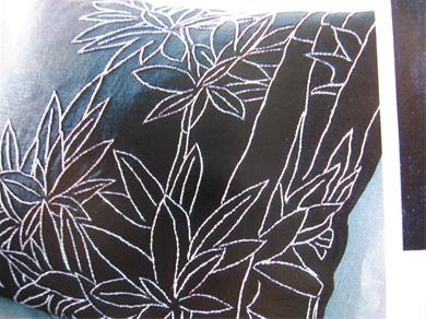 Het contrastkussen kan je maken in de maat 60×75 cm van zwart, grof linnen. Uiteraard kan je het kussen ook veel groter maken. Je borduurt met wit Anchor of DMC parelgaren met de steelsteek het motief op. Je hebt voor deze maat kussen 6 strengen nodig.