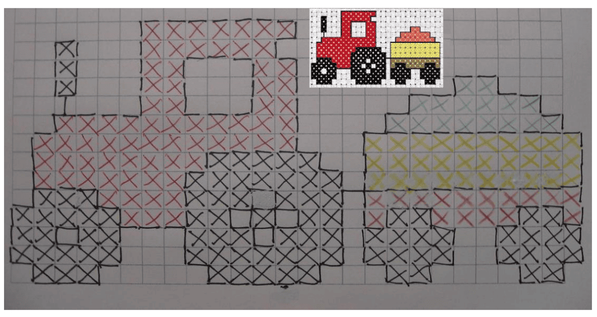 Kruissteekpatroon trekker of tractor. Een trekker borduren in kruissteek doe je met dit borduurpatroon. Maar hoe maak je kruissteken.