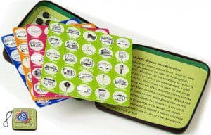 De reisbingo (ook bekend als autobingo) bestaat uit vier magnetische bingokaarten en 100 kleine rondjes om de afbeeldingen ‘aan te kruisen’. Op de kaarten staan onderwerpen als : vogel, koe en van politieauto tot kerk, restaurant en brug.