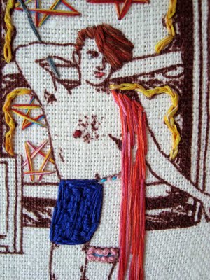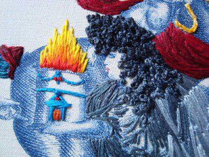 De kunstenaar Richard Saja borduurt vrij en creatief op oude dessins van kussens en gordijnstoffen. Hierdoor krijgen de duffe afbeeldingen een