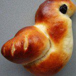 Maak uit een pak wit broodmix kleine broodhaantjes en gebruik voor de oogjes een kleine rozijn (krent). Voor de mooie bruine glans smeer je er hier en daar wat geklopt ei op.