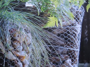 Vorm van kippengaas en stevig ijzerdraad een plantenpot. Vul deze kippengaas pot met stenen en stukjes hout. Zet er grassen en varens in en je hebt een zeer decoratief geheel.