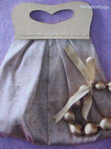 - rimpel de korte zijden tot de breedte van het handvat en naai of plak aan iedere kant een (goud) kartonnen handvat vast