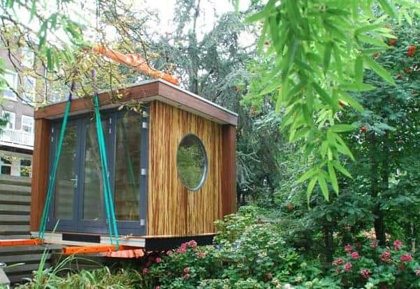 Je kunt een huisje van duurzaam materiaal kant en klaar, met alles erop en eraan in je tuin laten takelen. Een aantrekkelijke hobbyruimte of studeerkamer. Je hebt er geen vergunning voor nodig, wel euro’s. Vanaf 18.000 Euro, van 10 tot 30 m2.