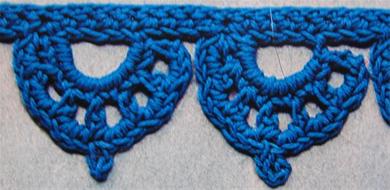 - Keren. Haak 3 vasten in elke 3 eerste boogjes, 1 picot op de 3e vaste van het 3e boogje (5 lossen en 1 halve vaste in deze vaste), dan 3 vasten op elke 3 laatste boogjes.