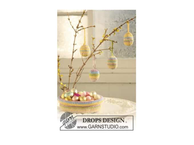 Haakpatroon paaseieren en mandje om een sfeervolhoekje te maken op de kast of op de tafel. Het mandje en de eieren zijn gemaakt van de licht glanzende muskat garens en het glimmende garen glitter van DROPS.