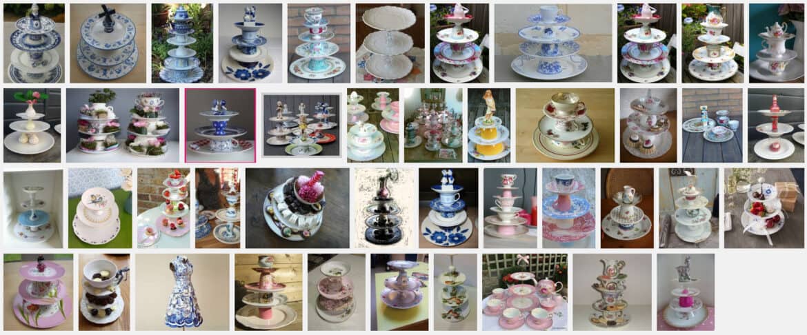 Etagere maken van oud en nieuw serviesgoed. Door oud en nieuw servies onderdelen te combineren ontstaat een unieke creatieve combinatie van brocante en nieuw serviesgoed.