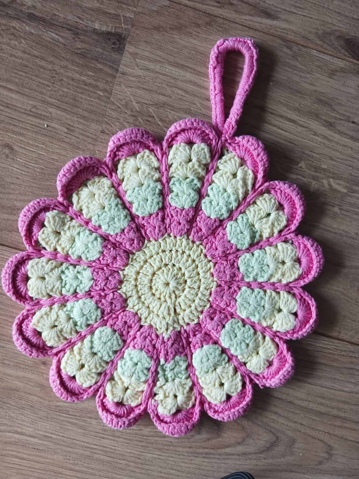 Hier zie je nog een mooi voorbeeld van het haken van een pannenlap of pannen-onderzetter.