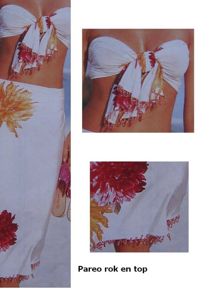 Pareo als rok en top met werkbeschrijving. De pareo mag niet ontbreken in je vakantiebagage. Een pareo is een omslagdoek die je kunt dragen als een rok of jurk, bijvoorbeeld op het strand. Hij is gemaakt van dunne, soepele stof, veelkleurig en met fraaie motieven. De doek wordt gedrapeerd om het lichaam op het moment dat daar behoefte aan is.