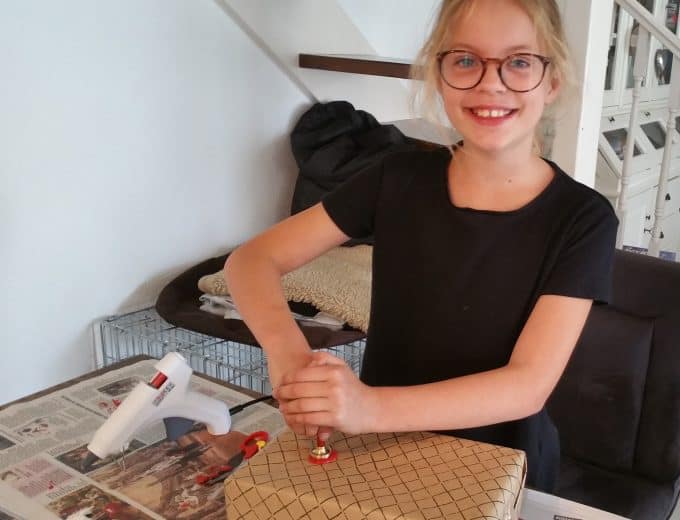 Inpaktip: Voor het inpakken zoek je ouderwetse plaatjes uit tijdschriften of boeken en die plak je op stevig bruin pakpapier. Wat ook mooi is om meerdere lagen vloepapier te gebruiken en daar de sfeerplaatjes op te plakken.