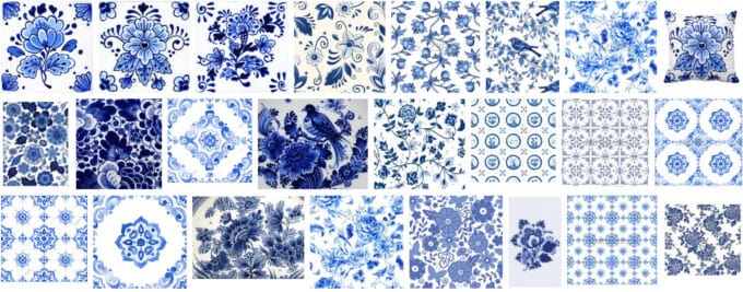 Delfts blauw impressie om creatief mee om te gaan. Je kan bijvoorbeeld een katoenen effen tafelkleed beschilderen met azuurblauwe textielverf met deze blauwe Delft patronen.