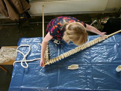 Breien met dikke bezemstelen is een uitdaging. De ontwerpster Christien Meindertsma breit vloerkleden met de hand op breipennen van bijna twee meter !!!