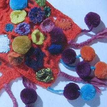 Maak de sjaal origineel door de beide einden van de sjaal te versieren met zelfgemaakte pompoms in vrolijke bijpassende kleuren en zo maak je er franjes aan.