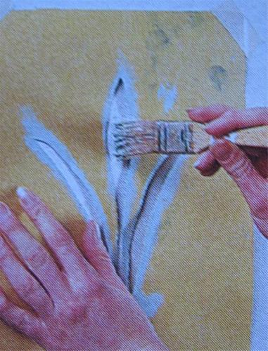 TIP: Niet wrijven met de kwast, want dan gaat het onder het karton door en krijg je vlekken. Probeer het eerst een paar maal op een stuk papier. Neem niet te veel verf aan de kwast.