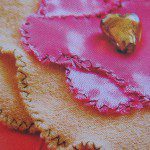 Knip twee lapjes in de vorm van een bloem en leg die gedraaid op elkaar. Knip nog twee kleinere bloemvormen en leg die er ook gedraaid op. Bovenop leg je een knoop of een kraal of een bedel en je naait de bloemcorsage door en door aan elkaar vast.- lapjes-schort maken
