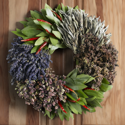 basiskrans van stro, groen (takken met bladeren) , conifeer laurier, kaneelstokjes, steranijs, kruidnagels in een kleine mandarijn, kleine appeltjes, gedroogde pepers, bloemistendraad.