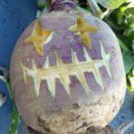 Schil met het scherpe mesje voorzichtig een zon, maan en/of sterren in de buitenkant van de biet/knol, zonder door de wanden heen te steken. Daar kan het lichtje (extra) doorheen schijnen
