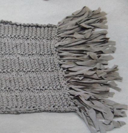 Kleedje breien met Noodle tricotband en breinaald 10. Met zes strengen Noodle breigaren ((Noodle is een tricotband) voor de breinaalden nummer 10 kan je een vloerkleed of badkamer mat breien.