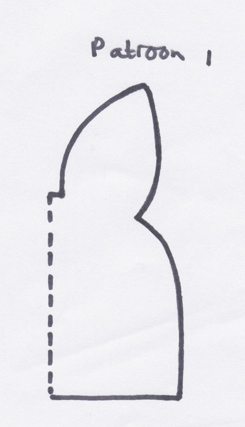 Vouw een vel vilt dubbel en speld het patroon van het haasje erop, tegen de vouw aan (de onderbroken streep ligt dus tegen de vouw aan). Doe dit 2 keer en leg de uitgeknipte helften van het hazenhoedjes op elkaar. Maak een stiksel om het patroontje heen en knip het vilt langs het stiksel af.