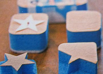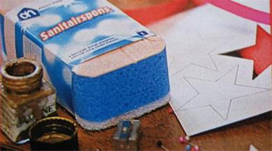 Zelf stempel maken van sanitair spons. Knip bijvoorbeeld een ster uit papier en zet de ster met een speld vast op de bovenkant van de spons en trek de omtrek met een stift na op de spons. Snij met een scherp mesje langs de lijntjes in de spons en haal alle spons buiten de ster weg, zodat je een stempel maakt.