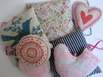 - lieflijk : de kussentjes van restjes (borduur)stof en/of oma’s linnen vul je met zachte poppenvulling en kruiden, betoverend borduren en maak er een leuk bandje (lintje) aan om het kussentje op te kunnen hangen