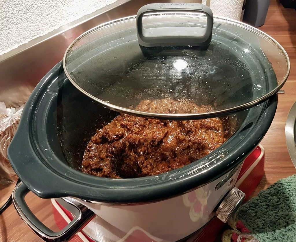 Doe de deksel op de slowcooker en smoor het vlees op stand HOOG, 5 tot 6 uur. Na 5 uur kijk je of het vlees al zacht is en uit elkaar valt en of er iets vocht bij kan.Â