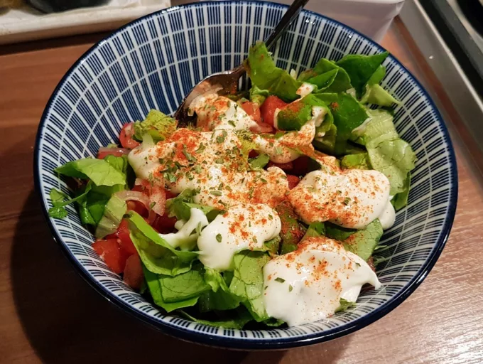 Botersla wassen, in reepjes snijden, 1 kleine ui fijn gesneden erop, kleine blokjes tomaat er op en maak zelf een mayonaise/yoghurt/citroensap sausje en giet over de sla. Beetje gerookte paprikapoeder er op en wat gedroogde peterselie.