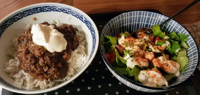 - Op tafel deed ik een schepje creme fraiche op het stoofvlees
