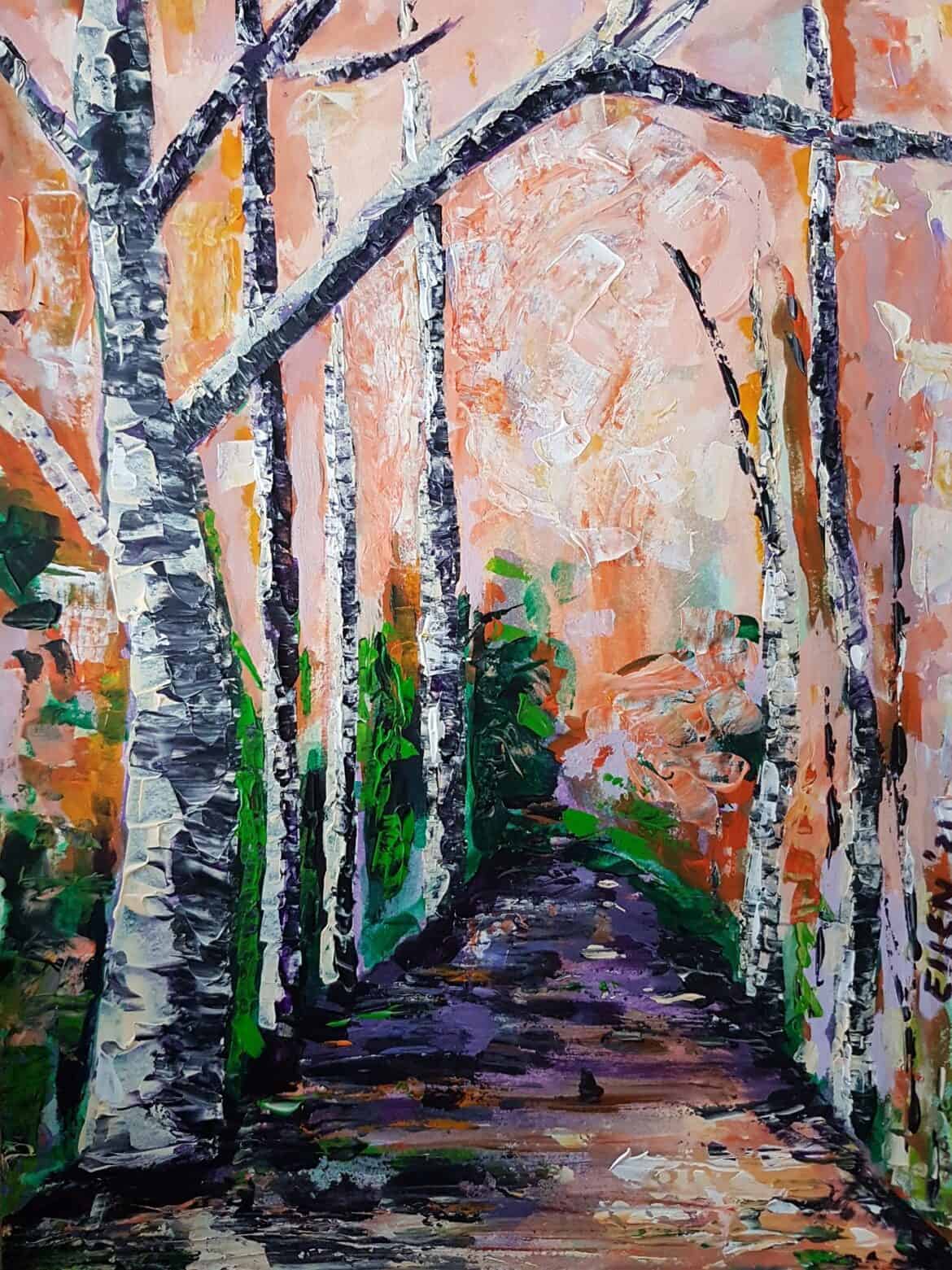 De weg naar het licht gemaakt in acrylverf op papier door Ellen Figee in november 2021. Nog niet zo lang geleden maakte ik deze bos impressie, vrij in kleurgebruik en met een goed en dankbaar gevoel. Toen ik mijn werk na een paar dagen weer eens goed bekeek, zag ik licht, licht dat in mijn leven gekomen is.