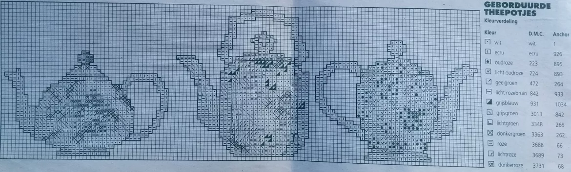 Theepotjes borduren patroon met DMC borduurgaren. Ik vond dit schattige patroontje in een schoenendoos met oude borduurpatronen. Je kunt een theepotje borduren op een theedoek of op een schort, op een geurzakje, langs een tafelloper of op een tafelkleed.