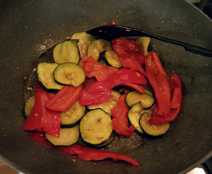 Doe in een schaal de in plakjes gesneden (1 cm dik) courgette en de in kwarten gesneden paprika. Meng de fijngesneden knoflook en wat olijfolie er doorheen en breng op smaak met peper en zout.