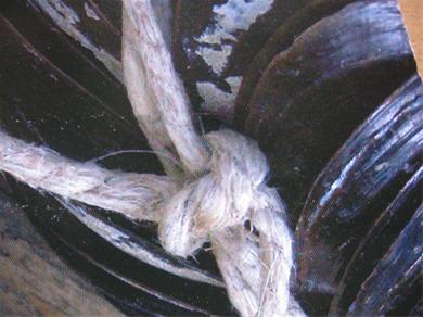 - Bind de krans van mosselschelpen met een stoer touw tegen elkaar, zodat hij niet meer uit elkaar kan vallen.