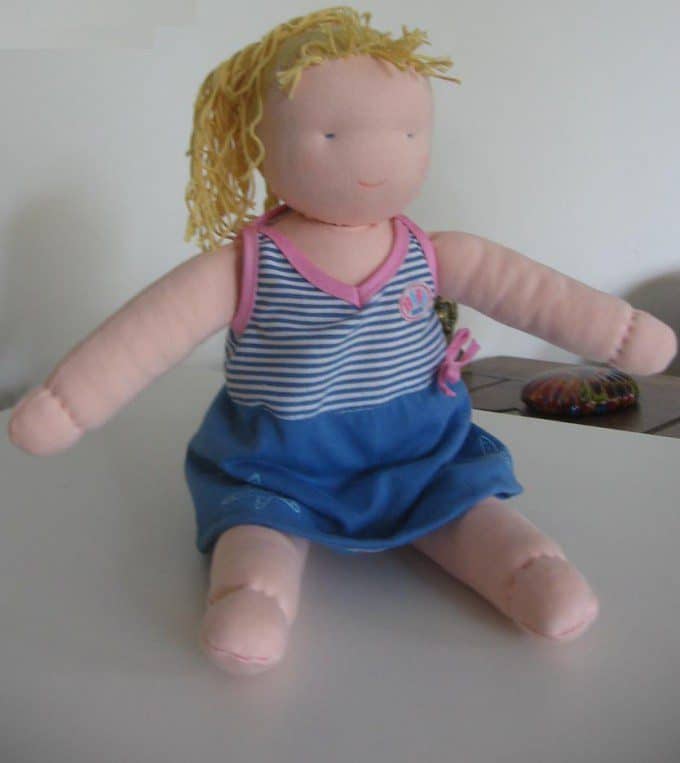 Als de pop helemaal klaar is teken je heel voorzichtig met kleurecht kleurpotlood 2 oogjes (lichtblauw) en een mond (zacht rood).