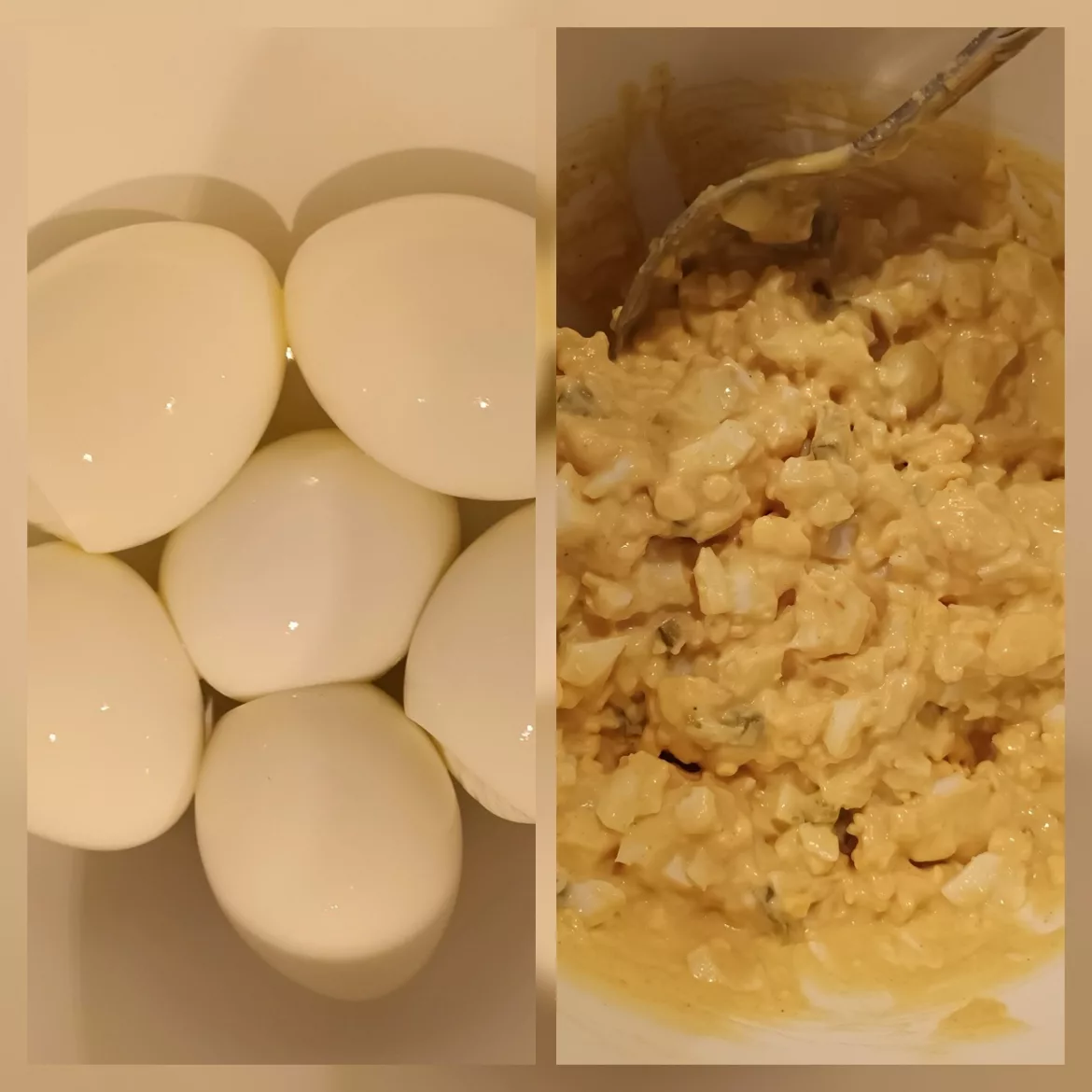 - Begin met het koken van de eieren, hard kookt en laten schrikken in koud water. Pel de eieren en snij in kleine stukjes.