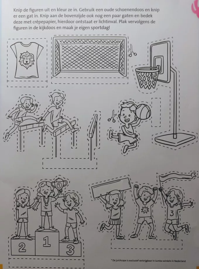 Kijkdoos sport knutselen. Het thema van deze kijkdoos is sport. Een ander thema voor een kijkdoos Kan zijn bijvoorbeeld een dynosaurus kijkdoos, een prins en prinsessen kijkdoos, een piraten kijkdoos, een aquarium kijkdoos, een garage (auto) kijkdoos, een manege (paarden) kijkdoos. (Bron: Jumbo)