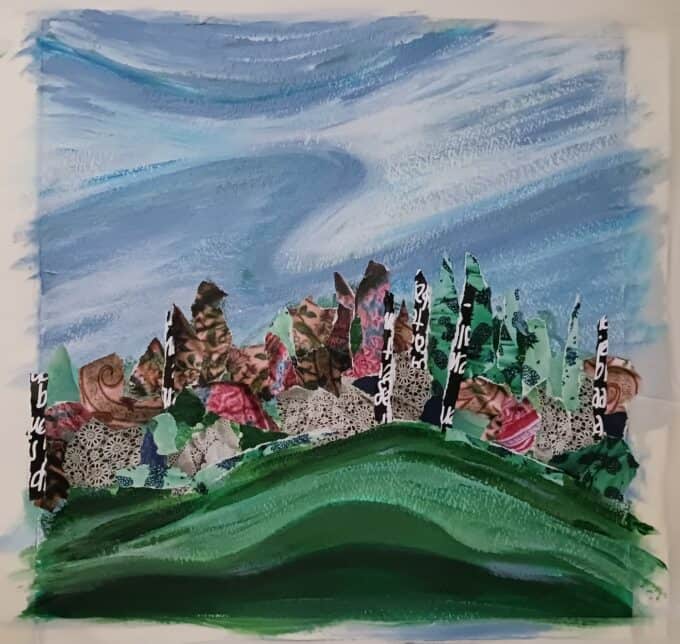 - Vervolgens ben ik het bos gaan accentueren met gescheurd papier uit tijdschriften. Hou de lichte vlakken in de gaten!
