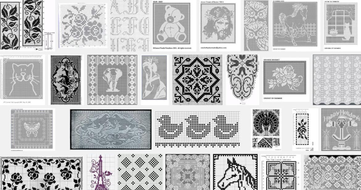 Wat is filet haken en gratis patronen. Een patroon filet haken (of kruissteek) gebruik je om bijvoorbeeld een gordijntje te haken met filet haakwerk. Met dichte vierkantjes en open vierkantjes. De werkbeschrijving en enkele gratis patronen van filet haken vind je bij de Hobbydoos
