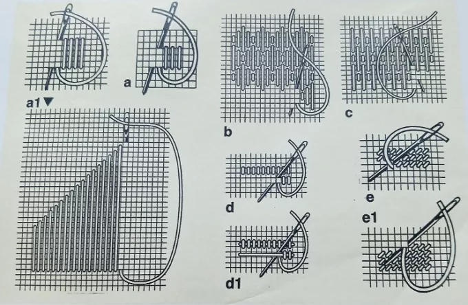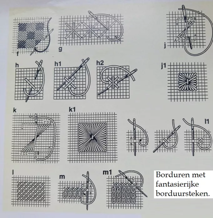 Borduren met fantasierijke borduursteken op stramien, katoen en dat vierkant geweven is (enkel of dubbeldraads). Mooi is als de dikte van het borduurdraad volledig de ondergrondstof (het stramien) bedekt. Als het stramien wat scheef is, span het dan recht en pers het licht op met een vochtige doek en het strijkijzer.