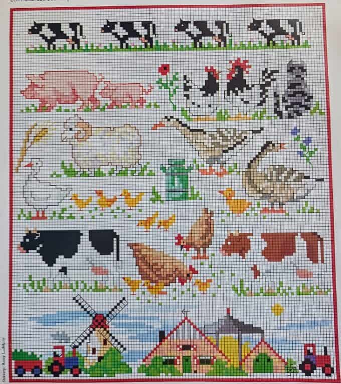 Kruissteek patroon rond de boerderij, een Hollandse boerderij. Met kruisteek patroontjes van een tractor, een hooiberg en alle boerderij dieren.