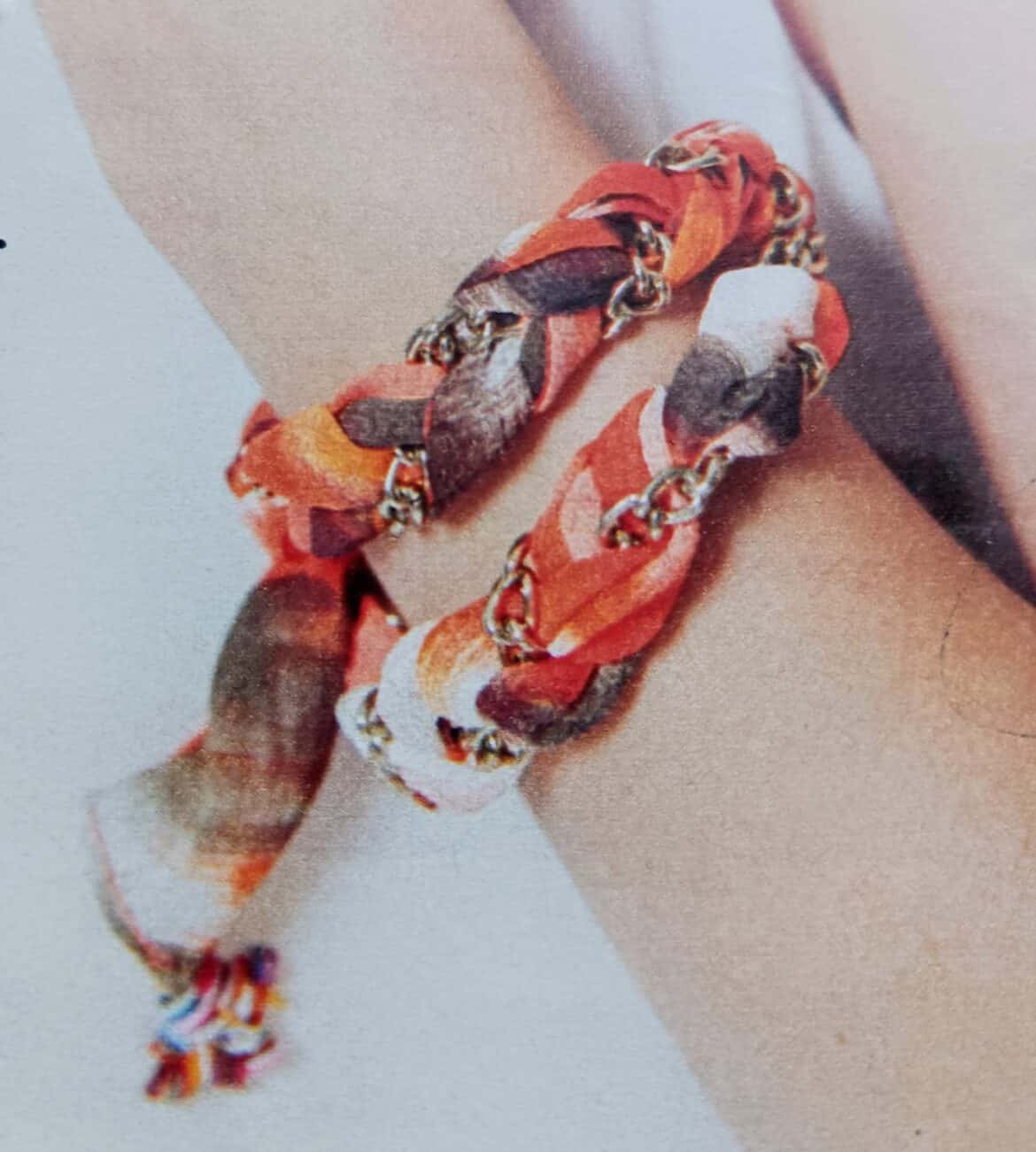 Armband ketting maken van restje stof en klein D-ringetje of rond ringetje. Je hebt 2 stroken soepele stof nodig van 70 x 6 cm. Deze lengte is genoeg voor een ketting die ook als armband draagbaar is. Je wikkelt hem dan twee keer om de pols. Leuk om voor beide linten verschillende gedessineerde soepele stof te gebruiken.