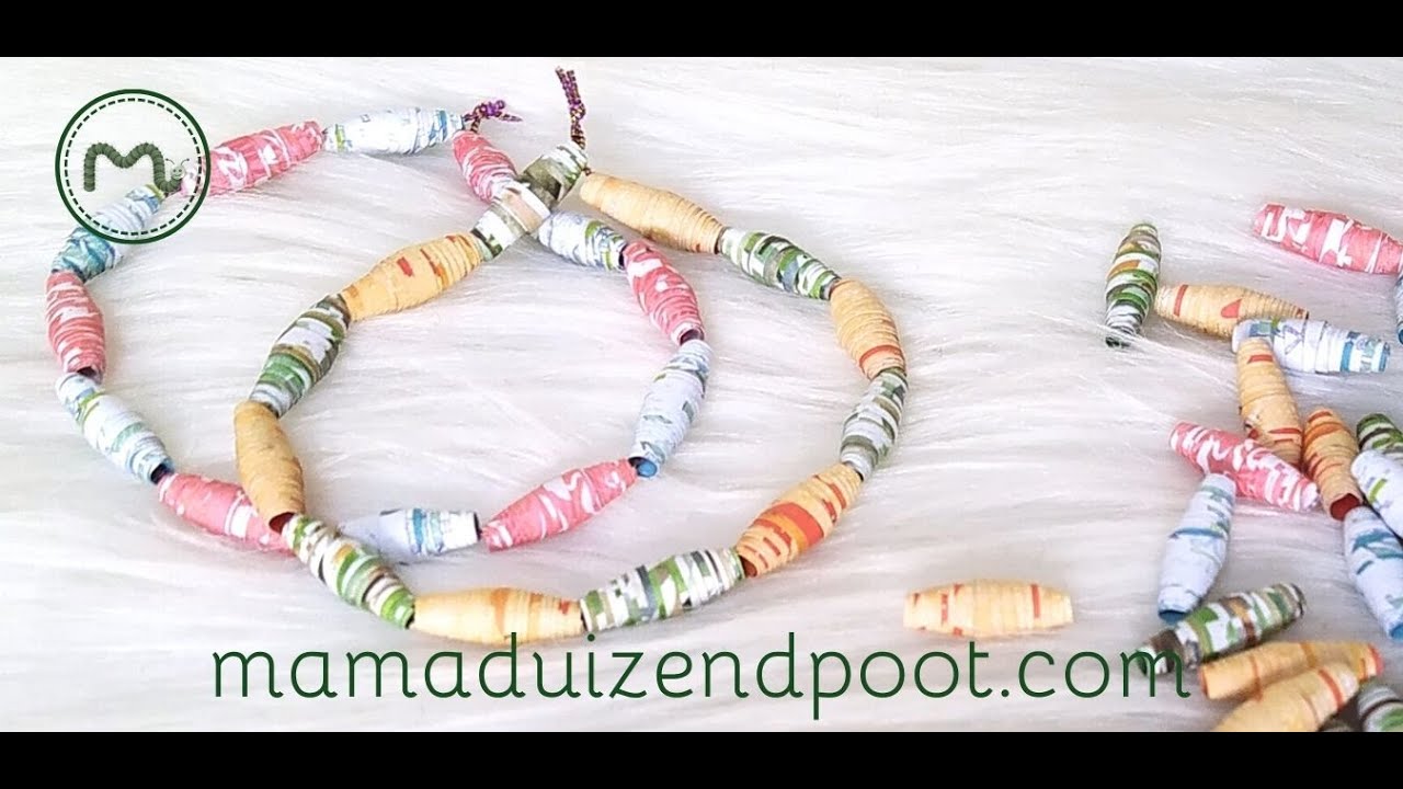 4. Rijg de papieren kralen op een stuk satijnen lint. Je kunt ook echte kralen toevoegen tussen de papieren kralen voor extra flair.