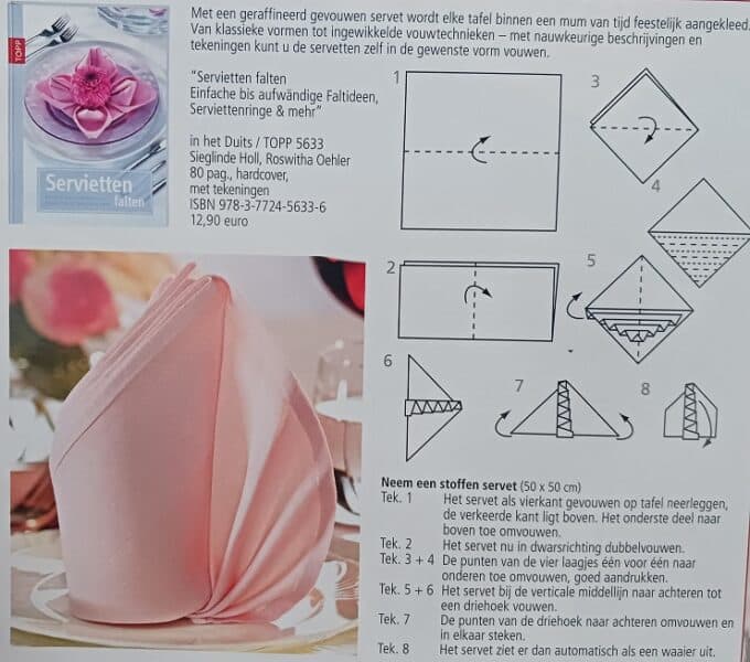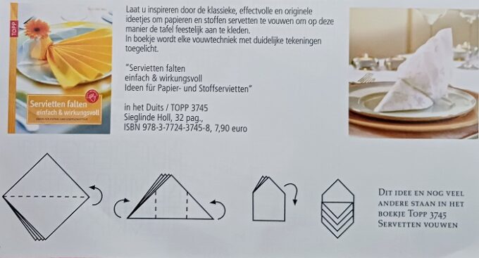 - En hier vind je nog veel meer hedendaagse voorbeelden van servetten vouwen voor op de (gedekte) tafel, zoals de clown, de paradijsvogel, de kandelaar, de piramide etc.