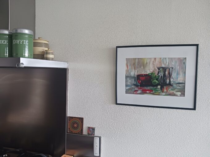 Een schilderij zoals op de afbeelding past ook goed in de keuken.