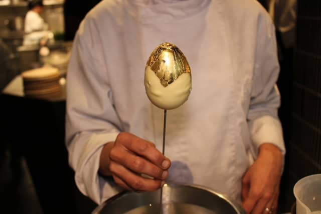 Het Paasmenu wordt feestelijk afgesloten met gouden paaseieren als dessert, gecombineerd met Ruinart Rosé NV 23, een champagne met het aroma van rode bessen, aardbei en braam.